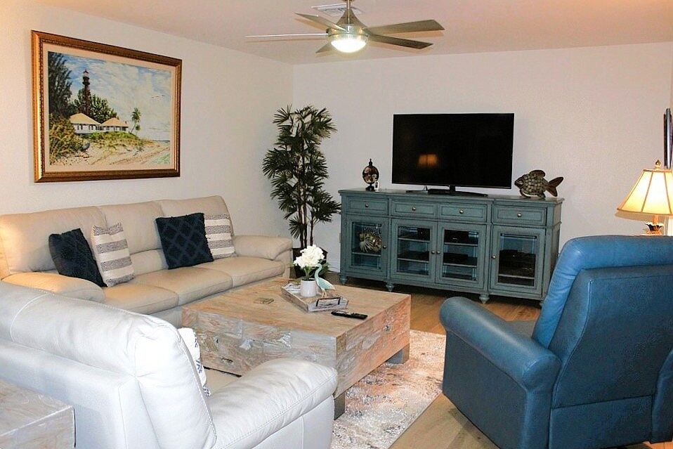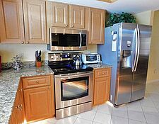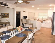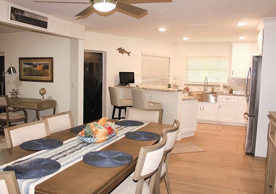Hidden Gem! Large 3/BR, 2/BA Pool Home with spectacular River view & Gulf Access is a boater's paradise! Immaculately maintained, this home offers everything you need to make your Florida vacation a dream come true! This home features a screened in front patio, oversized screened lanai & pool, sunning deck with wide canal views and a walking pier on the side of the property. Split floor plan, formal dining that seats 6, granite kitchen counter tops, white wooden cabinetry and stainless steel appliances are just the beginning! Master bedroom offers king size bed and large ensuite with his/her sink, 2 additional bedrooms offering king-size and twin beds respectively! No extra charge for spectacular views in every direction!